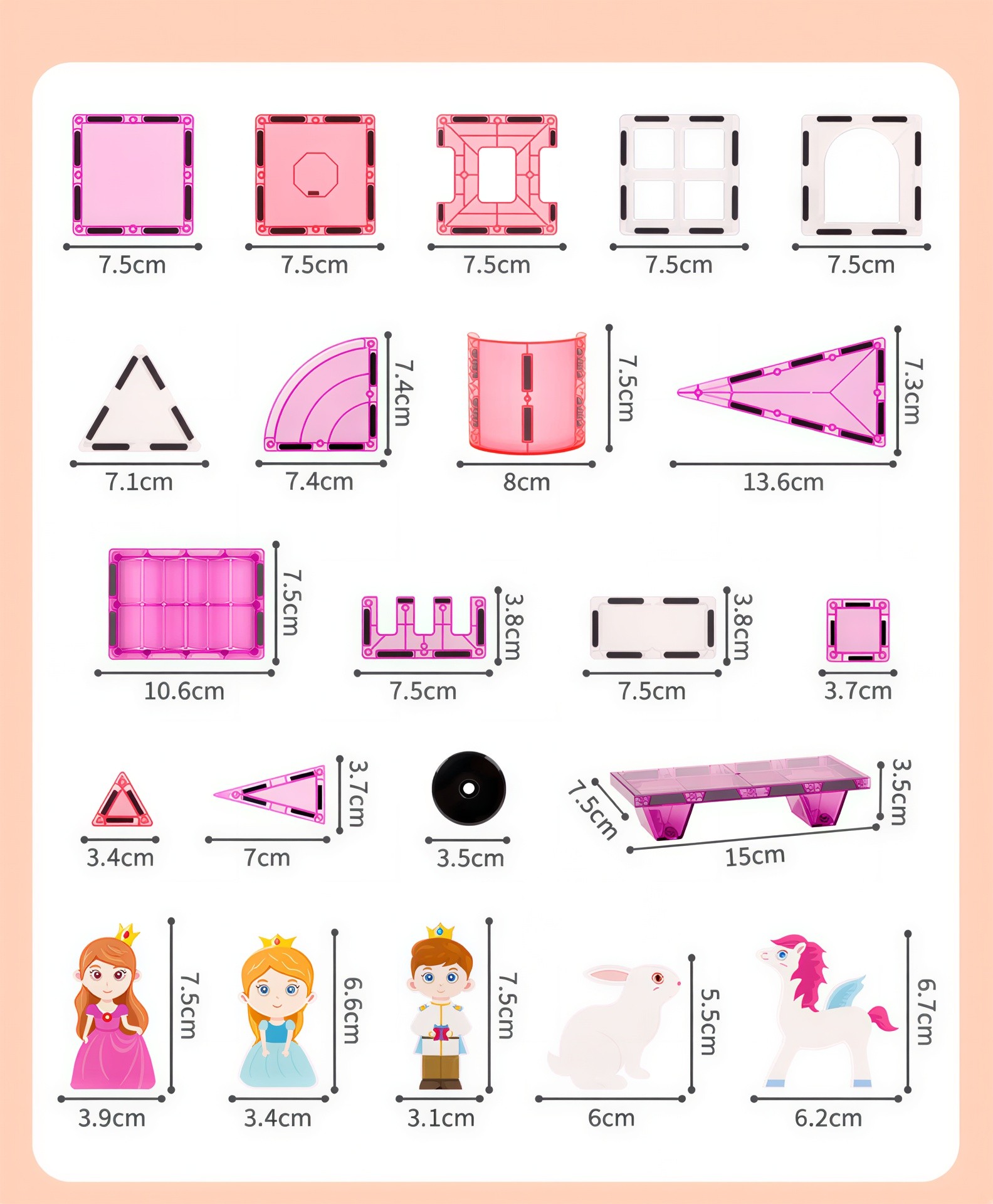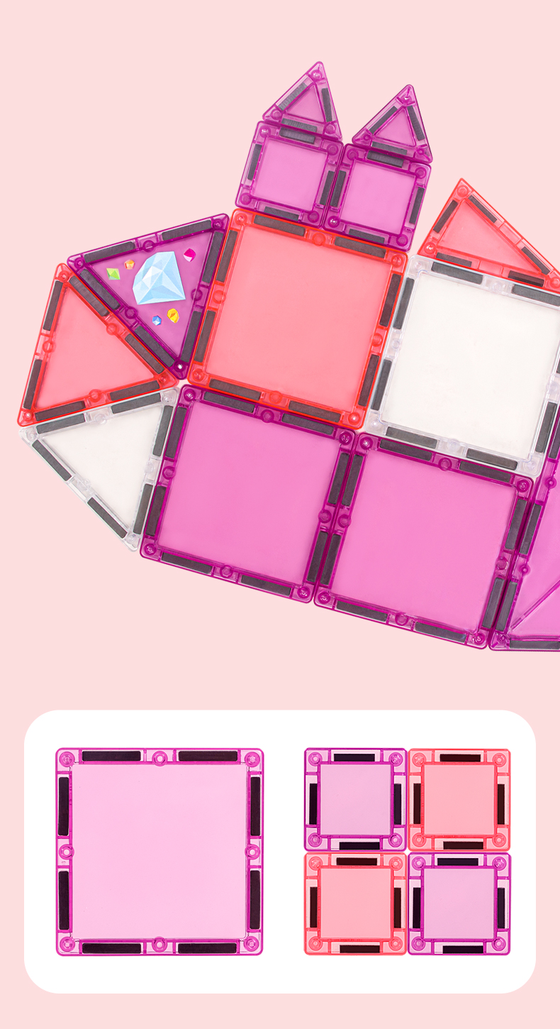 This magnetic building set is fully compatible with all LELINO series with dimensions of 7.5x7.5 cm. As well as with magnetic building sets of other brands with dimensions of 7.5 × 7.5 cm. For example from brands like Magna Tiles, Connetix, PicassoTiles, PlayMags, Colormag and others.